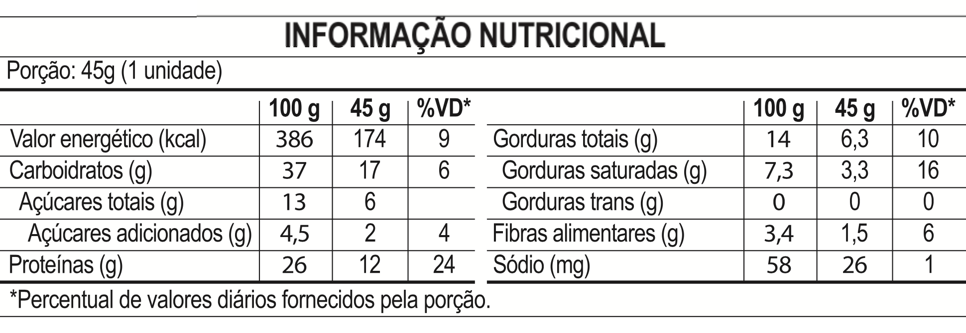 Crispies proteicos (proteína isolada de ervilha e farinha de arroz), cobertura sabor chocolate ao leite (gordura vegetal, soro de leite em pó, leite em pó integral, cacau em pó natural, estabilizantes maltitol e polidextrose, emulsificantes lecitina e INS 476 e aromatizante idêntico ao natural), marshmallow (clara de ovo em pó, edulcorantes sorbitol, maltitol e isomalt, conservante sorbato de potássio, aroma idêntico ao natural e espessante INS 466), xarope de arroz clarificado, amendoim, xarope de agave, farinha de amendoim, edulcorante eritritol, aromatizantes, emulsificante lecitina, acidulante ácido cítrico, conservantes sorbato de potássio e benzoato de sódio e antioxidante extrato de alecrim.